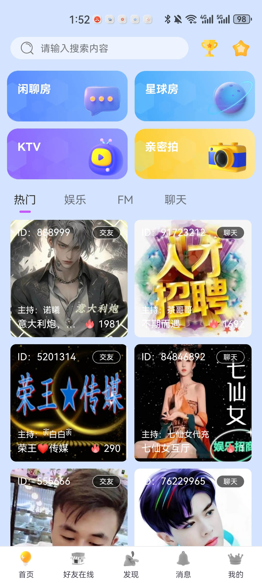 一:首页展示如下 聊天板块分类多样,有交友、闲聊、拍卖、相亲等聊天房。