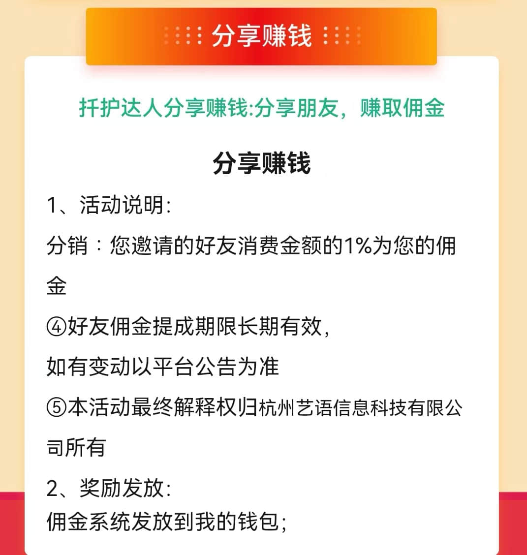 扦护达人有一个非常重要的版块——分销功能,平台拿出一部分利润回馈用户,用户可以申请专属于自己的分销渠道,通过专属二维码邀请新用户加入平台促成交易后,用户邀请的好友消费金额的1%为用户的佣金,且好友佣金提成期限长期有效。无需繁琐操作,简单几步即可开启。这种方式方式可以迅速形式裂变,通过分享赚佣金的机制,刺激用户拉新客户,如此一来客户不断增多,业务慢慢就越做越强了。