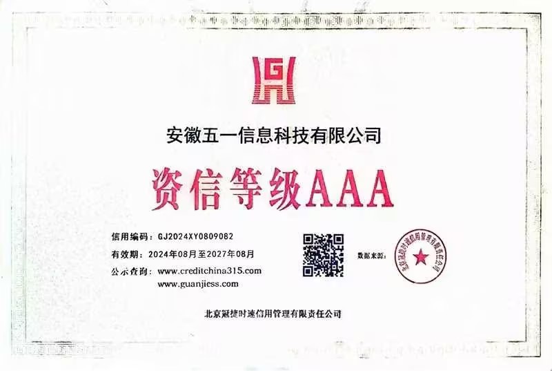 2024年8月27日,安徽五一信息科技有限公司荣获资信等级AAA的荣誉。